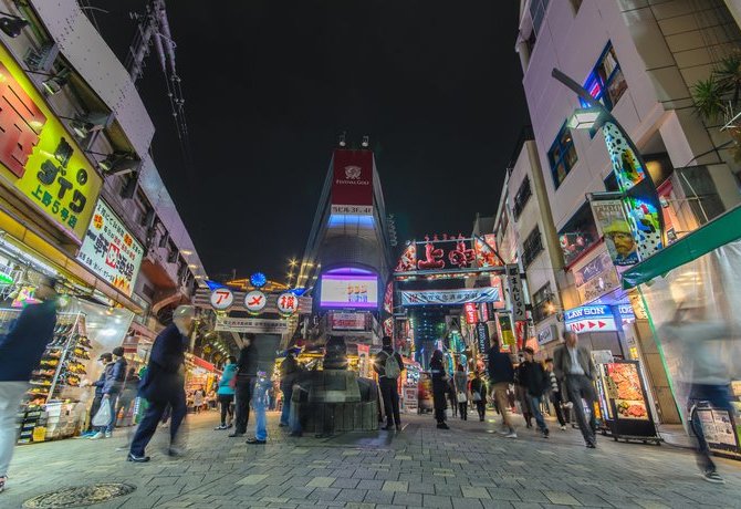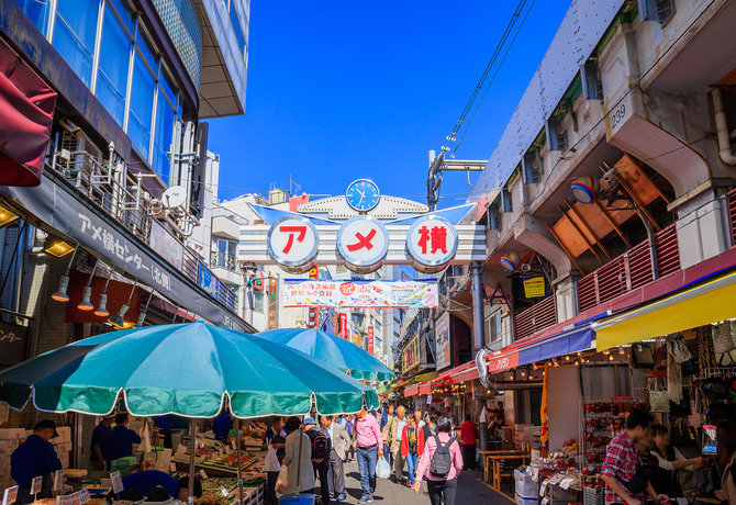 繁忙的阿美橫丁距離上野站只有幾分鐘路程,為一座部分露天的市場。您可以在此觀賞市場攤販叫賣商品。您可以一邊品嘗水果棒,一邊觀看“tatakiuri”小販以 1,000 日元售賣一整袋巧克力糖果。