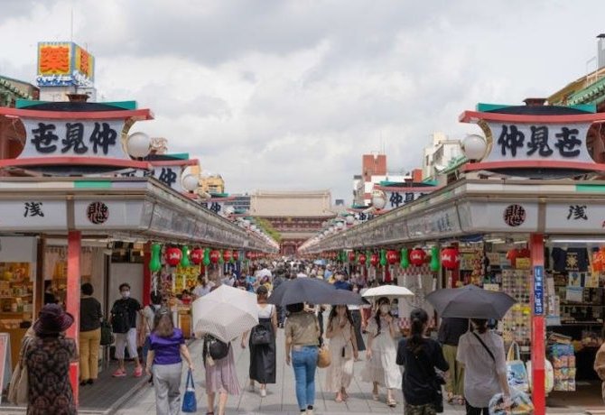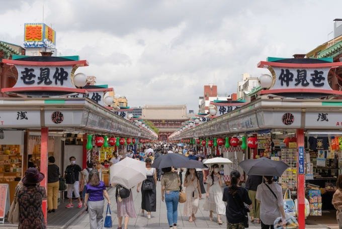 以石板鋪就的淺草仲見世商店街連接知名的淺草觀光景點雷門與淺草寺,兩旁林立著典型日式風格的朱紅色建筑。