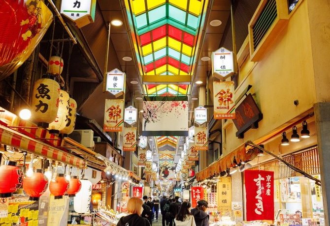 對美食愛好者來說,任何地方都比不上錦市場。錦市場又被稱為“京都的廚房”。您會發現,這條長 400 米的狹窄巷道里有形形色色的商家,售賣從豆腐甜甜圈和鵪鶉蛋到高級瓷器與廚具等各種商品。盡管高峰時期人潮擁擠,錦市場還是持續吸引著當地人前往。