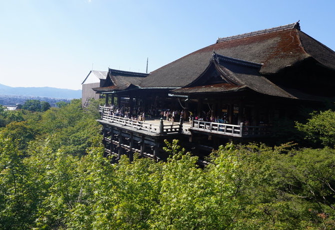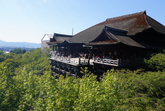當您看到街道變窄,成群結隊的郊游學童在紀念品商店外閑逛時,您就知道制作可以俯瞰整個城市的宏偉寺廟就在眼前。1200 年前建成的本堂或者主廳有一個很大的木制舞臺,看起來像浮在樹頂。在秋天的夜晚,燈光照亮紅色楓葉。千萬別錯過圣水的瀑布,據說能讓愿望成真。在主廟后面還有一個小小的神道神社——地主神社,傳說有助于戀愛運。