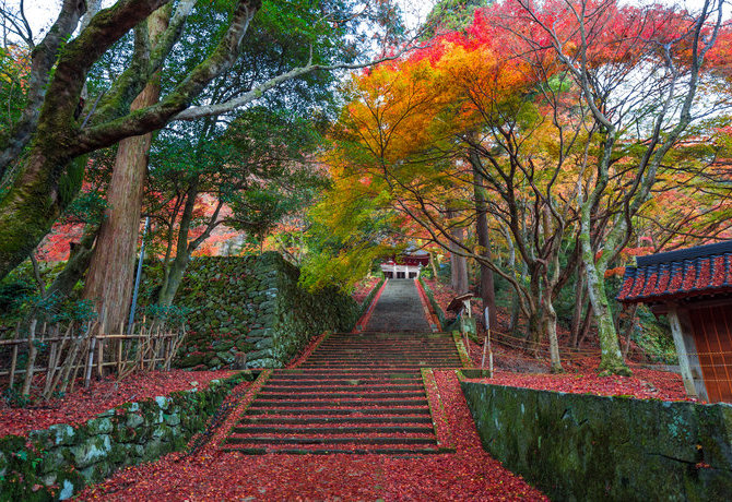 鱷淵寺座落于出云大社上面的青翠山丘上,是一座神秘無比的寺廟。在寺內悠游的同時,不妨前往觀賞僧兵弁慶修行的瀑布。弁慶的故事代代相傳。每年 11 月,鱷淵寺都會舉行秋葉祭來紀念他。秋季是一年之中最值得造訪的觀景時節。