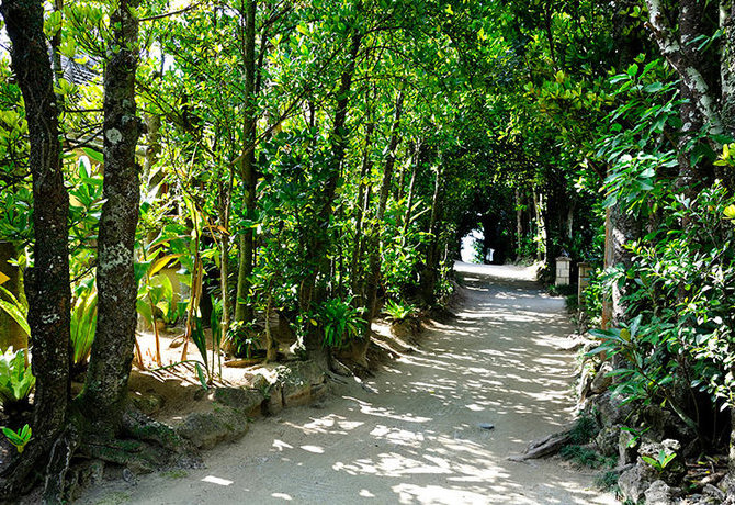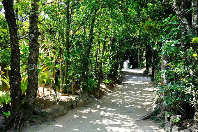 美麗海水族館的北邊是依然保留著原貌的傳統沖繩民居。在為了防止房屋受暴風雨破壞而栽種的福木(藤黃屬樹木)之間漫步。這些樹木沿著道路兩旁排列,綿延約 1 公里,是沖繩獨有的景點。