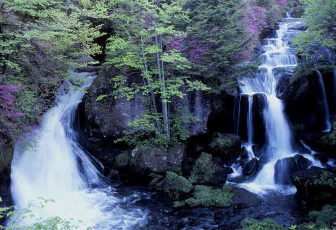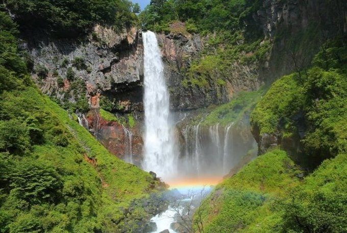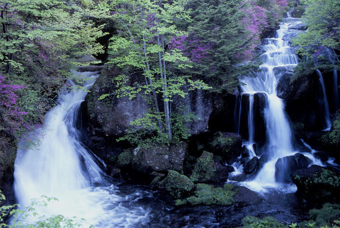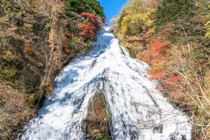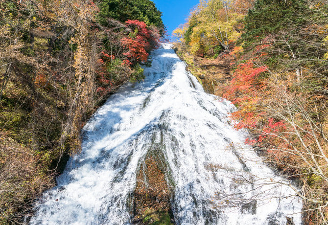 龍頭瀑布因形似龍頭而得名,每年九月底,這里就會最先披上秋色。湯瀑布位于日光湯川 (Yu River) 的上游,是一座寬達 25 米的壯麗瀑布。瀑布從 70 米高的陡峭巖石上飛撲而下。
