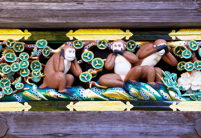 日光東照宮的神廄舍以知名的三猿猴雕刻為特色,擺出“非禮勿視、非禮勿言、非禮勿聽”的逗趣姿勢。