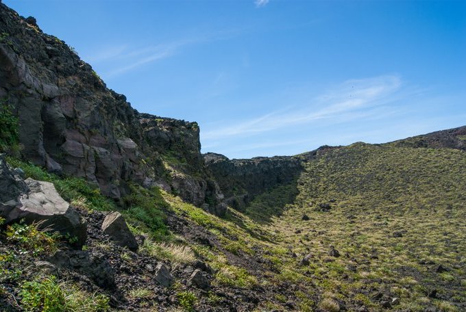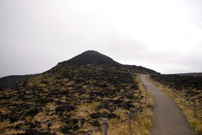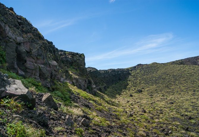 名為 Ohachi-meguri 路線的山頂步道環繞著直徑約 300 米的火山口,沿著步道,仔細觀察火山口里的紅棕色沉積物。