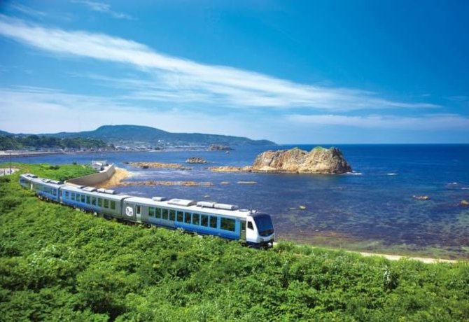 - 搭乘通過白神山地山腳的五能線電車,在車上欣賞美麗的風景
